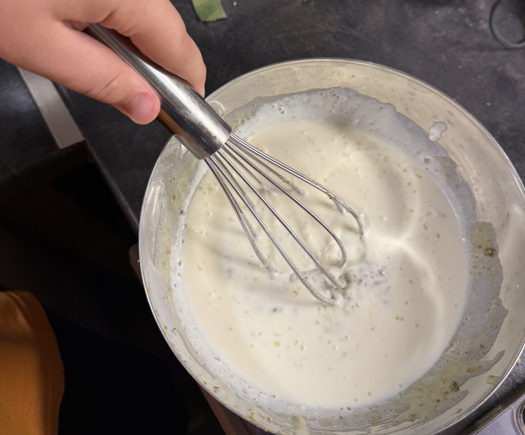 2. Keverd össze a pisztáciát a sűrített tejjel, majd öntsd bele a tejszínt és keverd el.